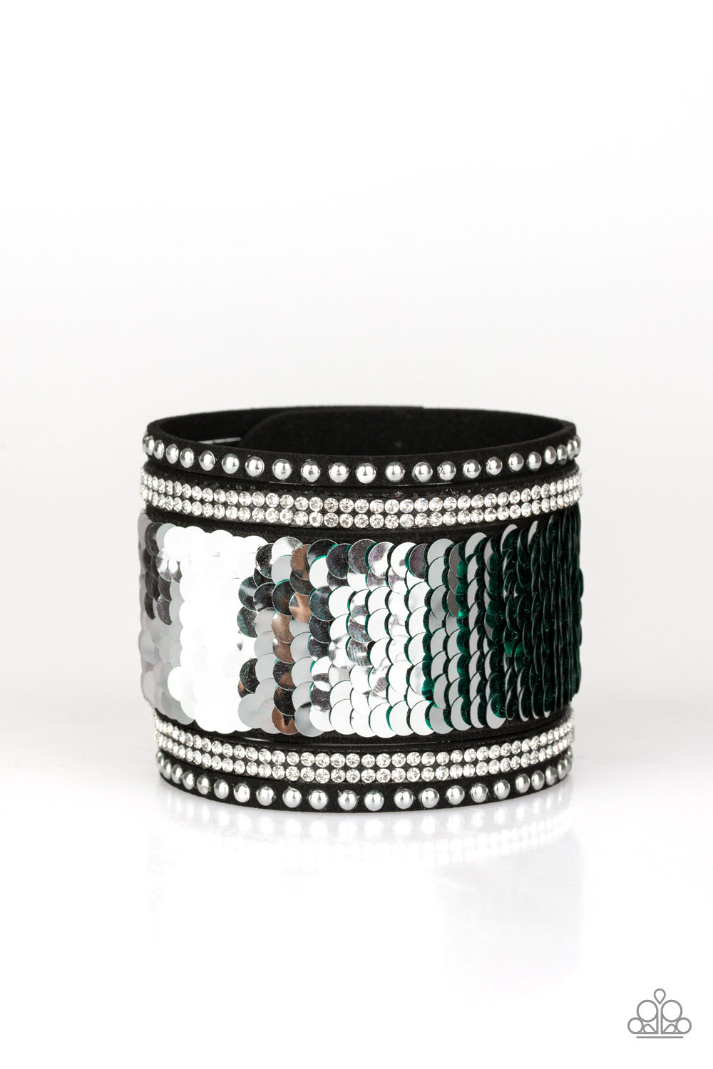 Shiny silver studs, glassy white rhinestones, and shimmering sequins are sprinkled across a thick black suede band that has been spliced into five glittery rows. Bracelet features reversible sequins that change from green to silver. Features an adjustable snap closure.