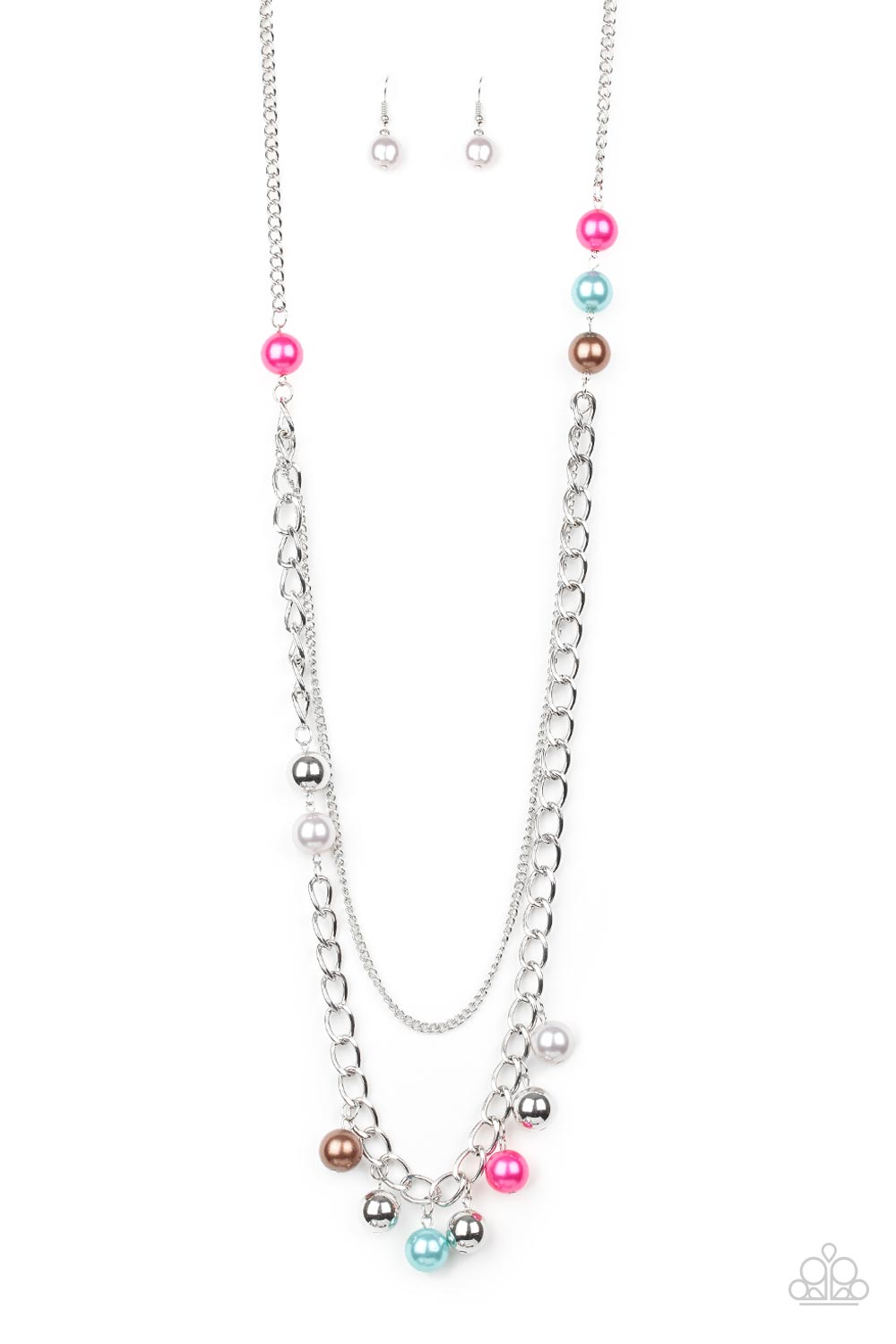 A collection of oversized multicolored pearls gives way to mismatched layers of silver chains down the chest for an asymmetrical look. Dotted with oversized pearls and shiny silver beads, a matching beaded fringe swings from the bottom of the lowermost chain for a modern twist. Features an adjustable clasp closure.
