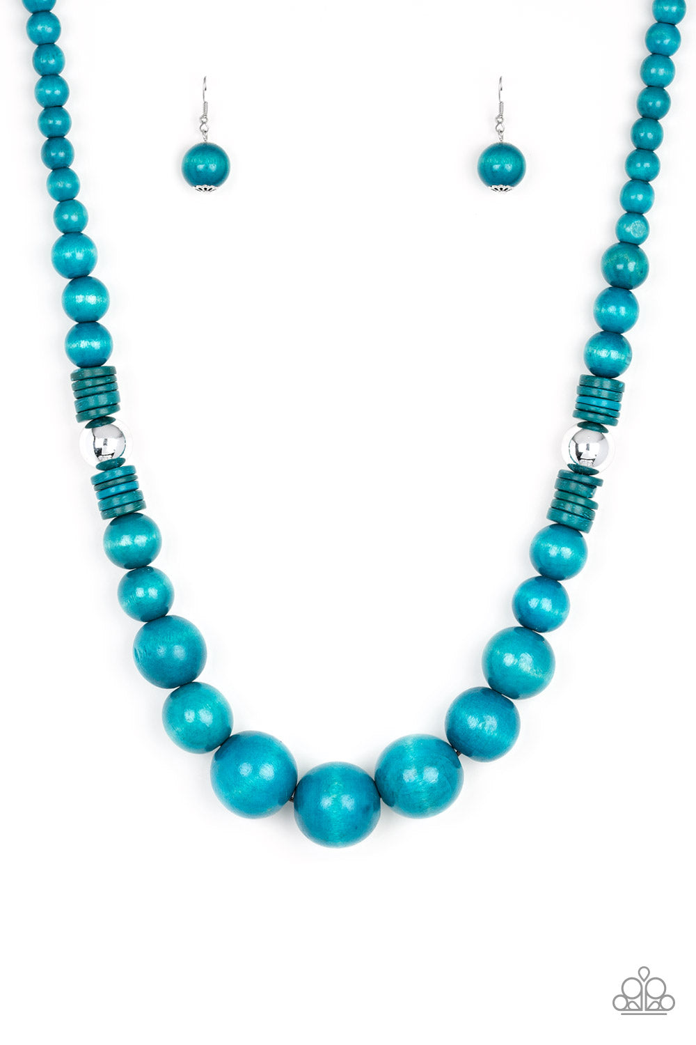 Infused with dramatic silver beads, an array of refreshing blue wooden beads drape across the chest for a summery look. Features a button-loop closure.