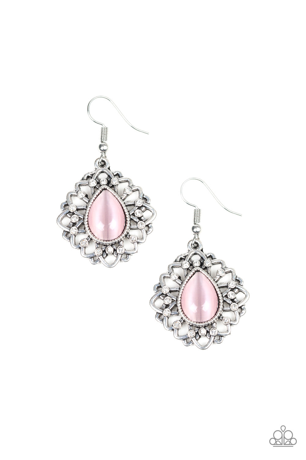 A glowing pink cat's eye teardrop is pressed into the center of a frilly silver frame radiating with glassy white rhinestones for a refined look. Earring attaches to a standard fishhook fitting.
