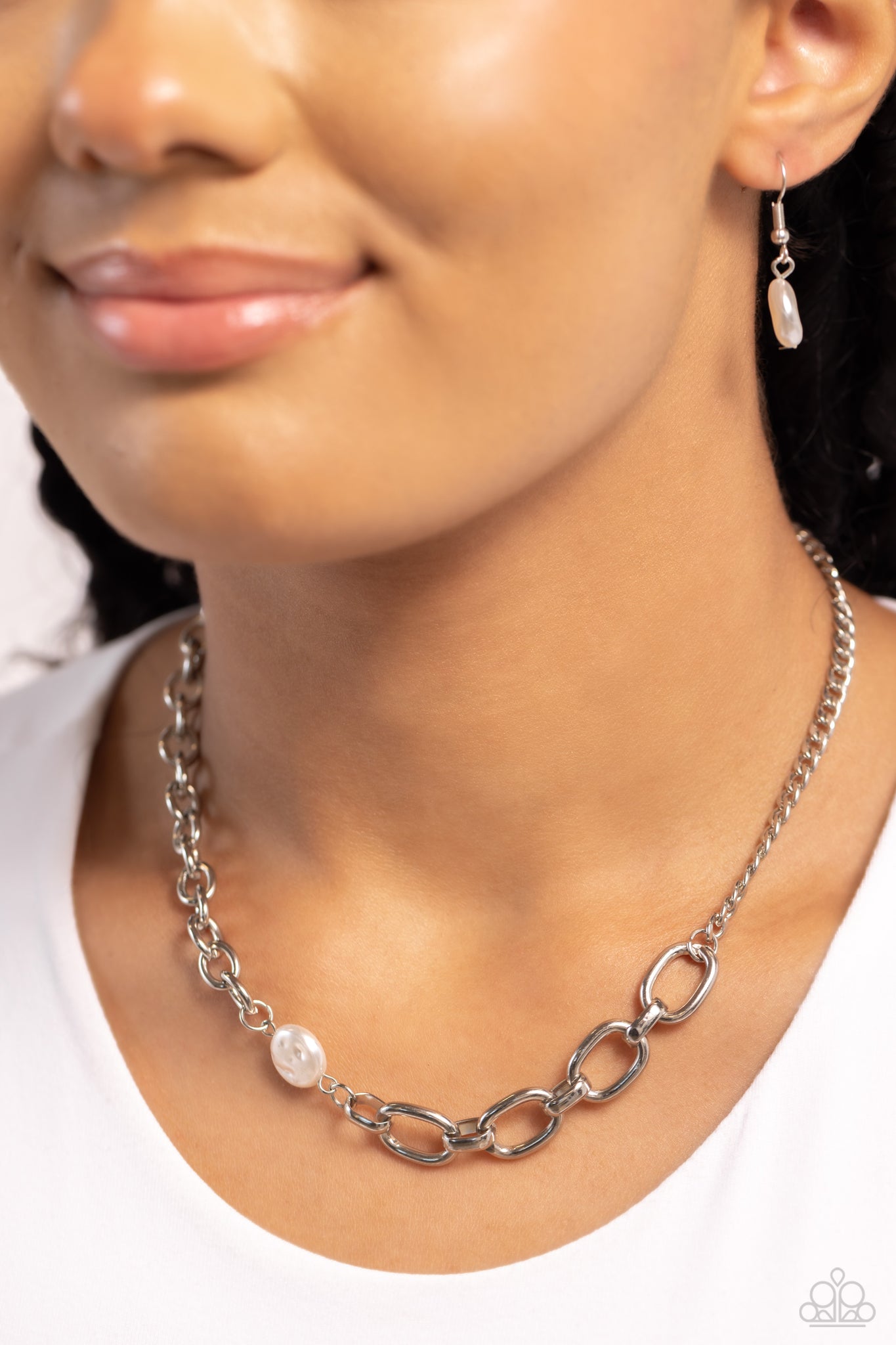 A hammered pearly white bead sits asymmetrically between two mismatched oversized silver chains, adding an industrial twist to the timeless look. Features an adjustable clasp closure.