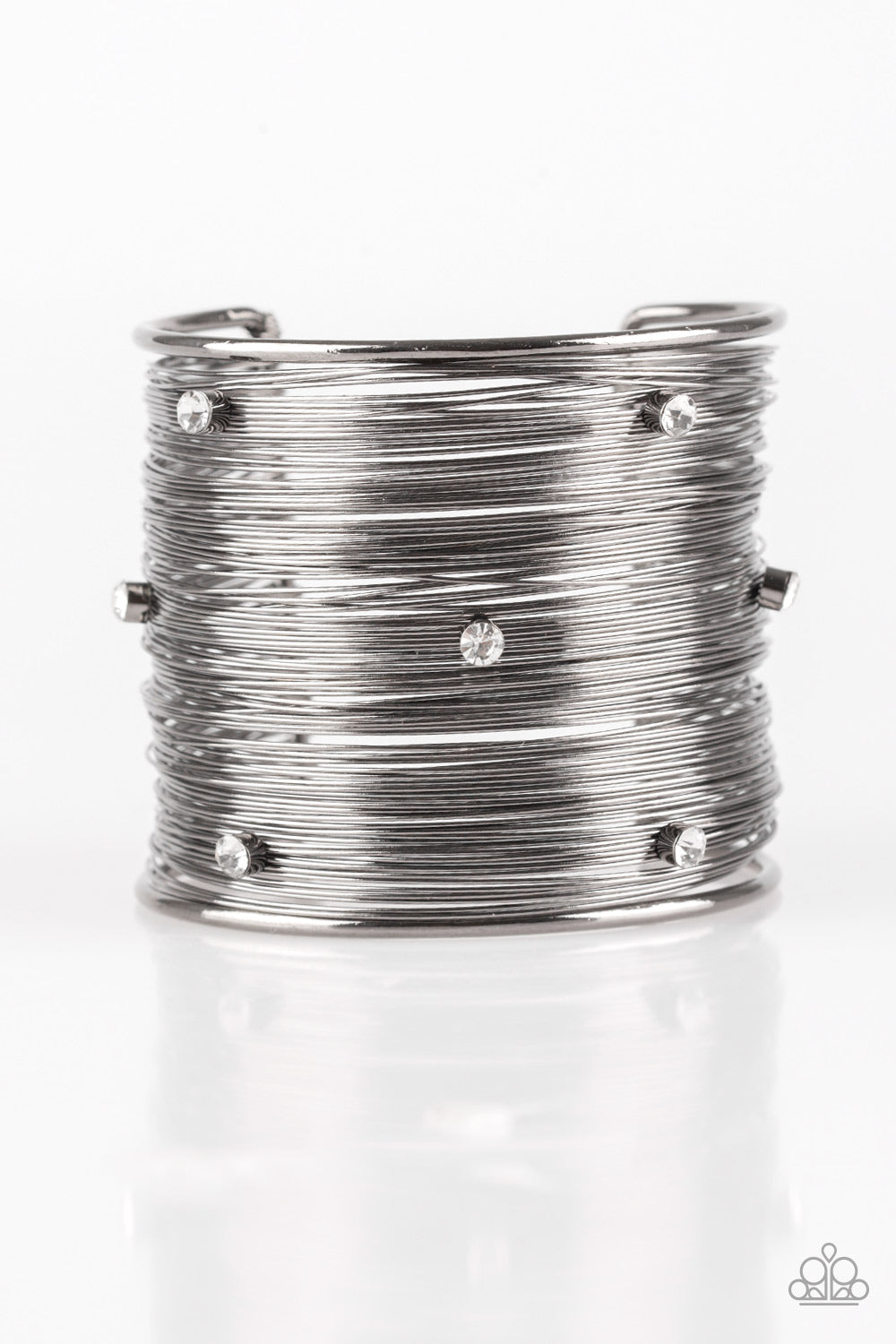 Shimmery gunmetal wires wrap back and forth along a gunmetal frame, creating a bold cuff. Glassy white rhinestones are sprinkled across the dramatic cuff for a glamorous finish.