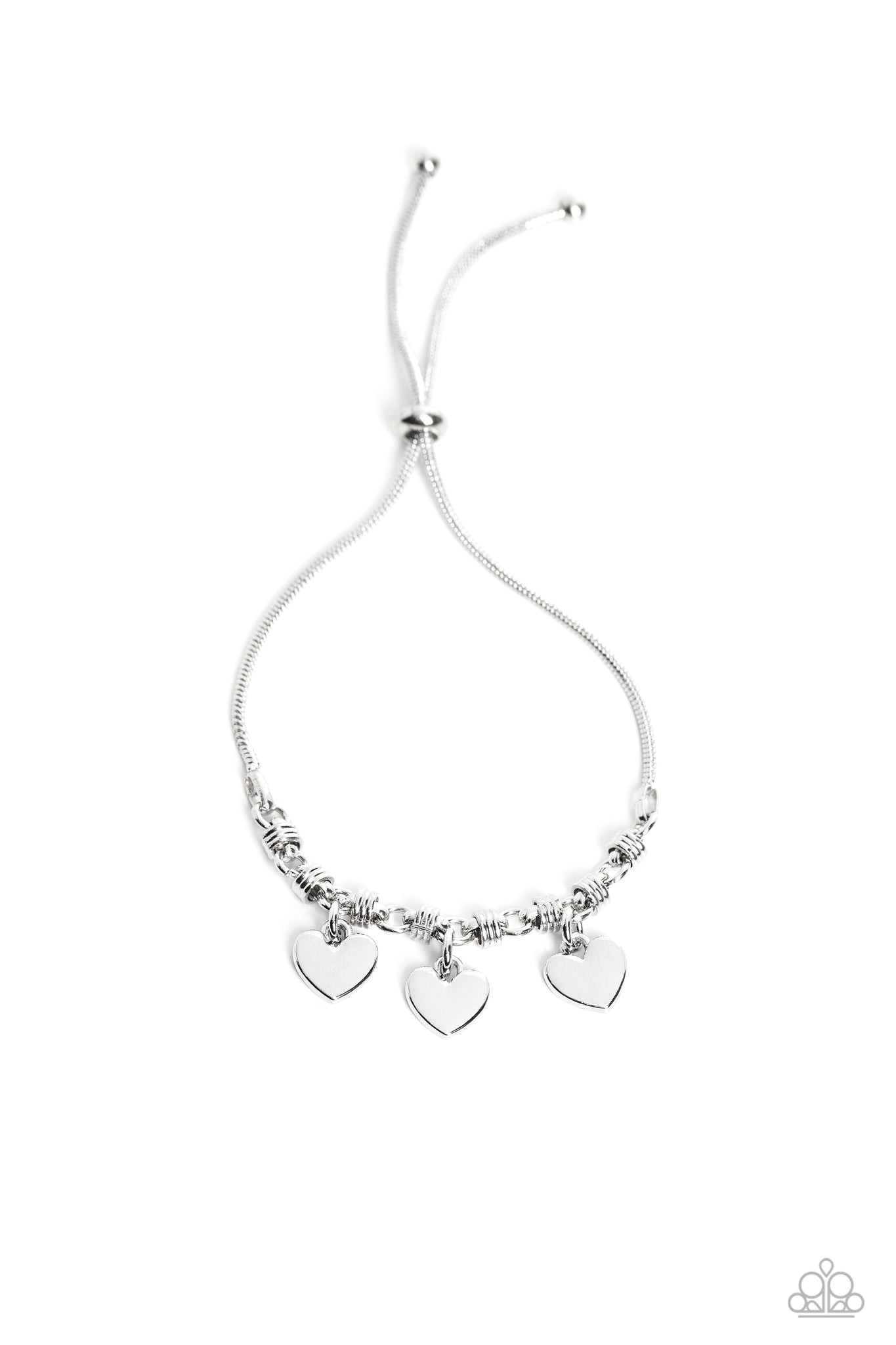 Dangling from a silver snake chain, a trio of silver hearts link across the wrist for a dash of swoon-worthy sheen. Infused along the heart chain, silver spiral-like accents add additional texture to the monochromatic design. Features an adjustable sliding knot closure.