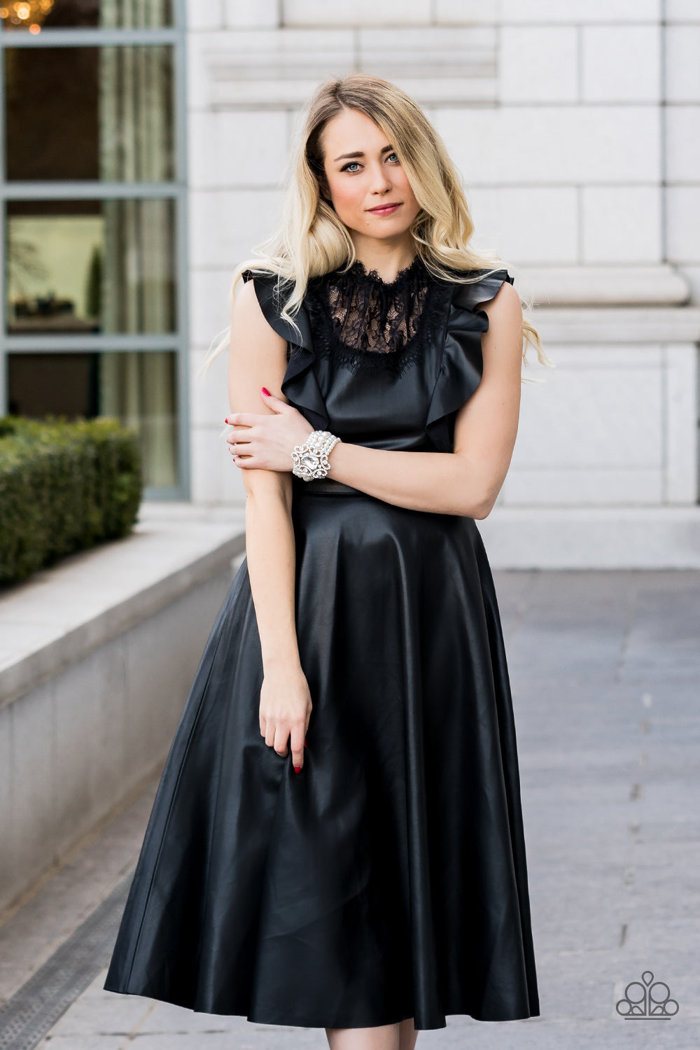A dramatically oversized emerald cut gem adorns the center of a white rhinestone encrusted filigree filled frame. The blinding centerpiece attaches to bubbly rows of pearl beaded stretchy bracelets, creating a gorgeous statement piece.