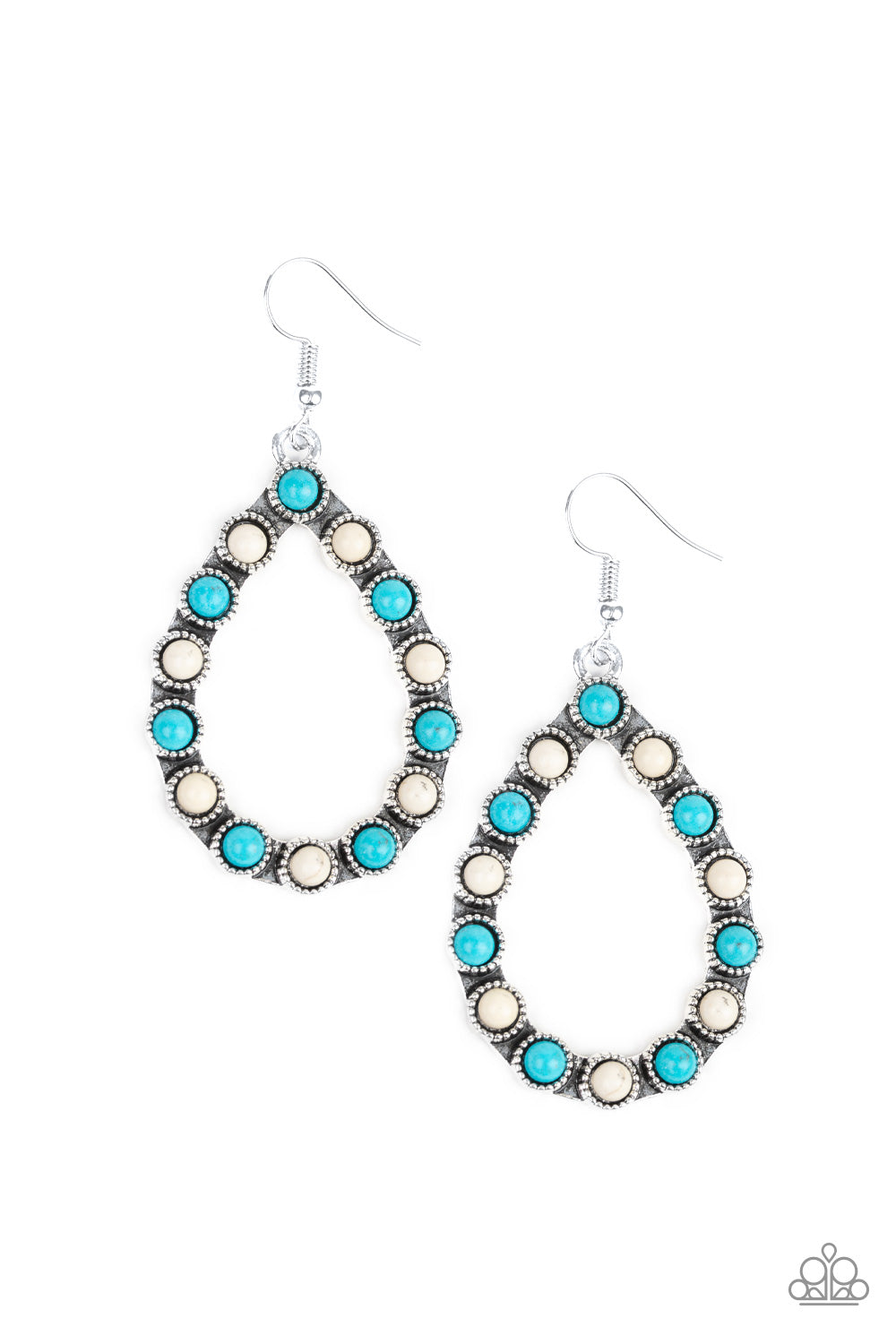 Dainty white and turquoise stone beads are encrusted along the front of a shimmery silver teardrop, creating a seasonal lure. Earring attaches to a standard fishhook fitting.