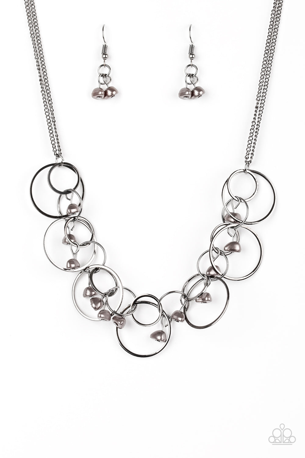 Bits of gunmetal pearlescent beading trickle from rows of interlocking gunmetal hoops, creating a refined fringe below the collar. Features an adjustable clasp closure.