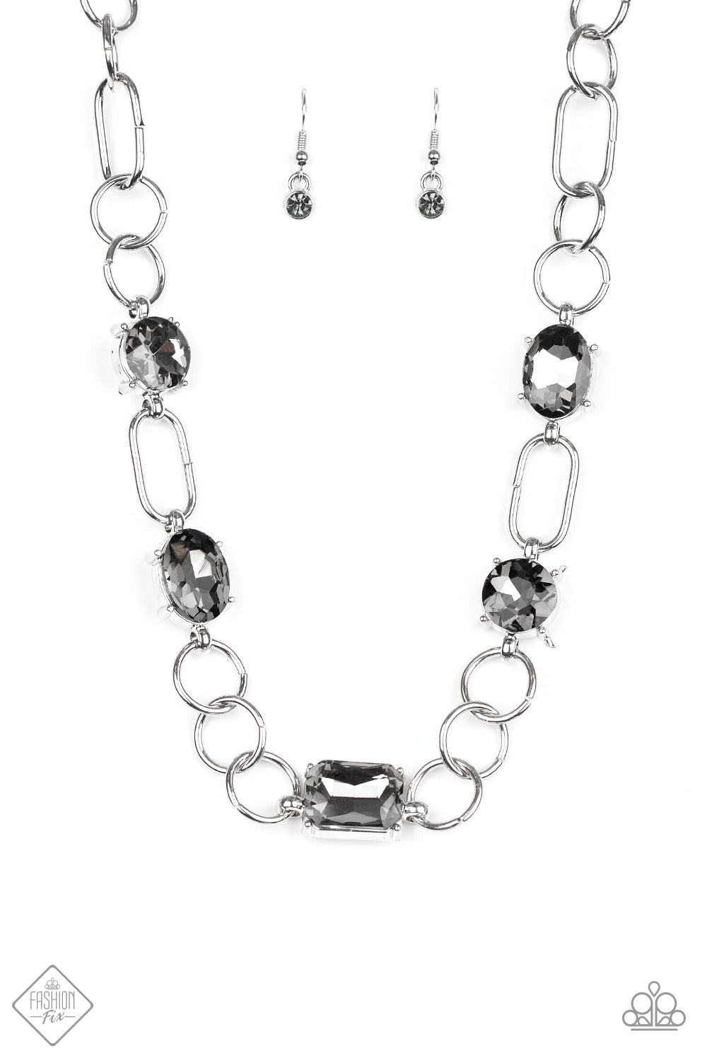 A collection of smoky rhinestones in a variety of round, oval, and emerald cuts are strung together by mismatched silver links below the collar for an edgy glamorous look. Features an adjustable clasp closure.